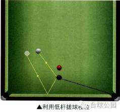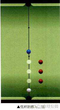 【练习】低杆搓球在实战中主要用来减少击打角度球和薄球后白球运行的距离。一般不做单独的杆法练习,但可将目标球放在7分球点位上,在其上方不远处放一红球,白球首先在角度较大的位置(大于45度角),利用低杆搓球来击打7分球,使白球在打进7分球后,校到一个击打红球较舒服的位置,如果是八球可以用相同花色的球进行相应的练习。