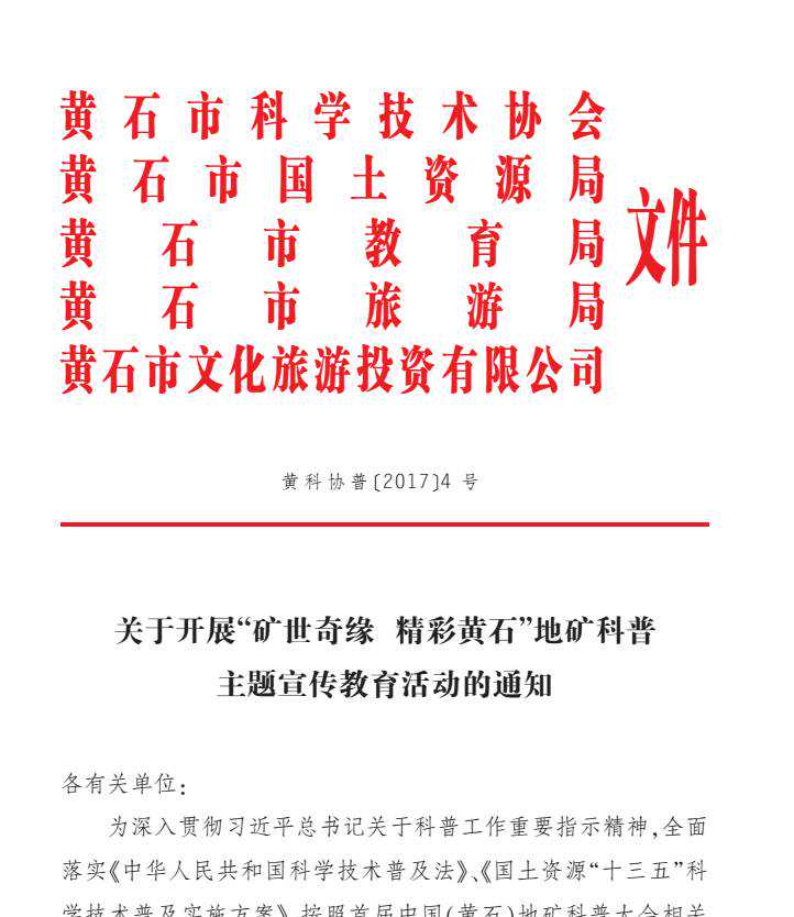 根据黄石市科协、市教育局、市国土资源局、市旅游局、黄石市文旅投公司联合下发的《关于开展“矿世奇缘精彩黄石”地矿科普主题宣传教育活动的通知》(黄科协普【2017】4号),黄石城市传媒文化发展有限公司在全市组织实施“地矿科普进学校、进企业、进社区”主题宣传教育活动。