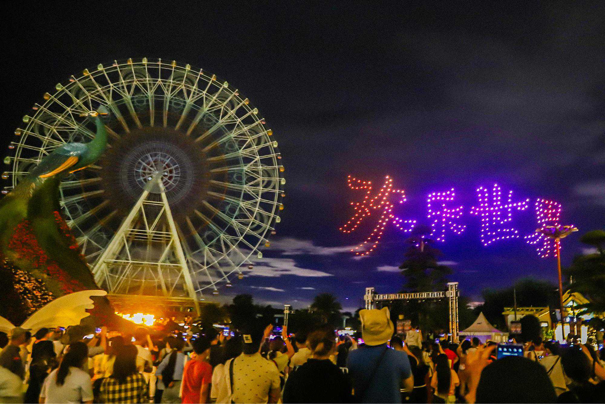 夜幕下乐园里震撼的无人机表演和幻彩滇池烟花秀,将一整天的欢乐与激情烘托到最高潮。
