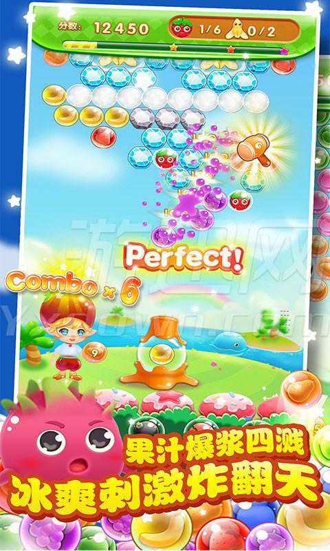 水果大变身,果汁爆浆四溅,酷爽到爆。多个游戏萌主任你挑选,让你随时随地萌翻天;多种游戏玩法酷炫来袭,让你趣味拯救精灵;更有椰林树影、海洋风情,夏威夷无时无刻都在陪伴你,配合超级疯狂的创意消除,动感十足的背景音乐,让你尽情释放指尖的魔力,赶快加入我们的泡泡龙大冒险吧!