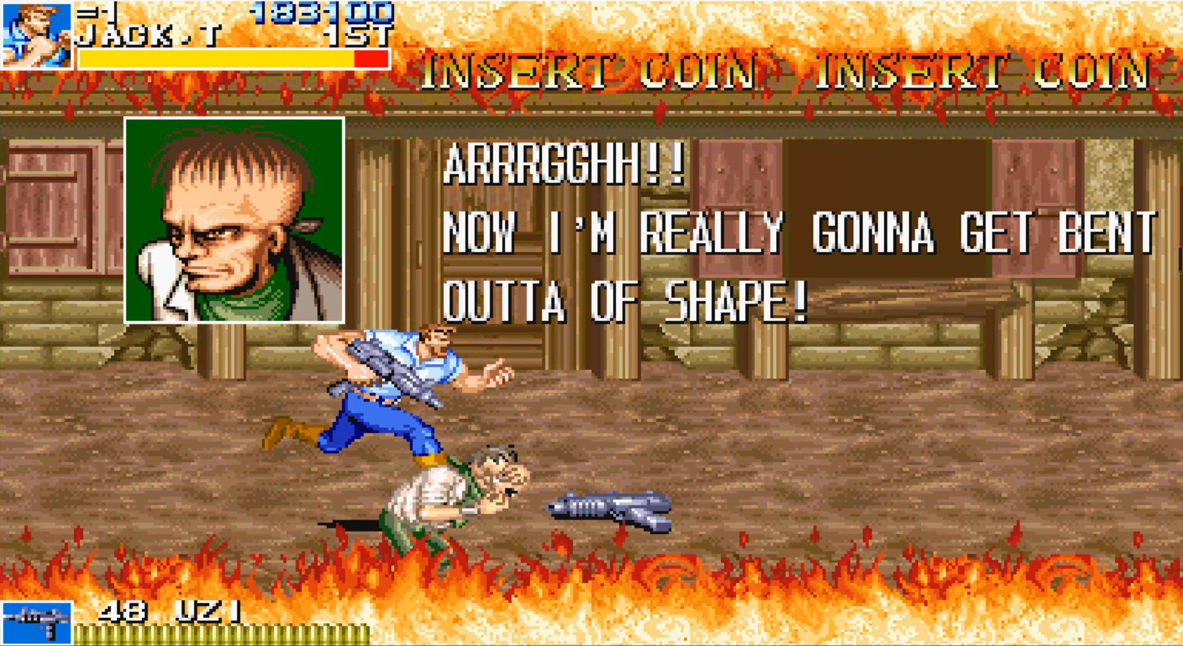 作为“恐龙快打”中第二难打的BOSS(我个人认为),小老头莫格(其实他并不老)值得我们多说几句。他的机枪与手雷对我们都是极大威胁,尤其是手雷会跟踪我们的位置连续投掷,跑得稍慢就要挨炸。由于他身形矮小,受创面积也小,我们的“前前拳”有时只擦个边,无法使他倒地。他被打倒后,如果我们和他距离过近,他起身必然会用枪托攻击,全身无敌。如果你执意出拳,百分之百挨打。再就是这里会刷出一波波杂兵,尤其有可恶的小猴子,致使场面非常混乱。