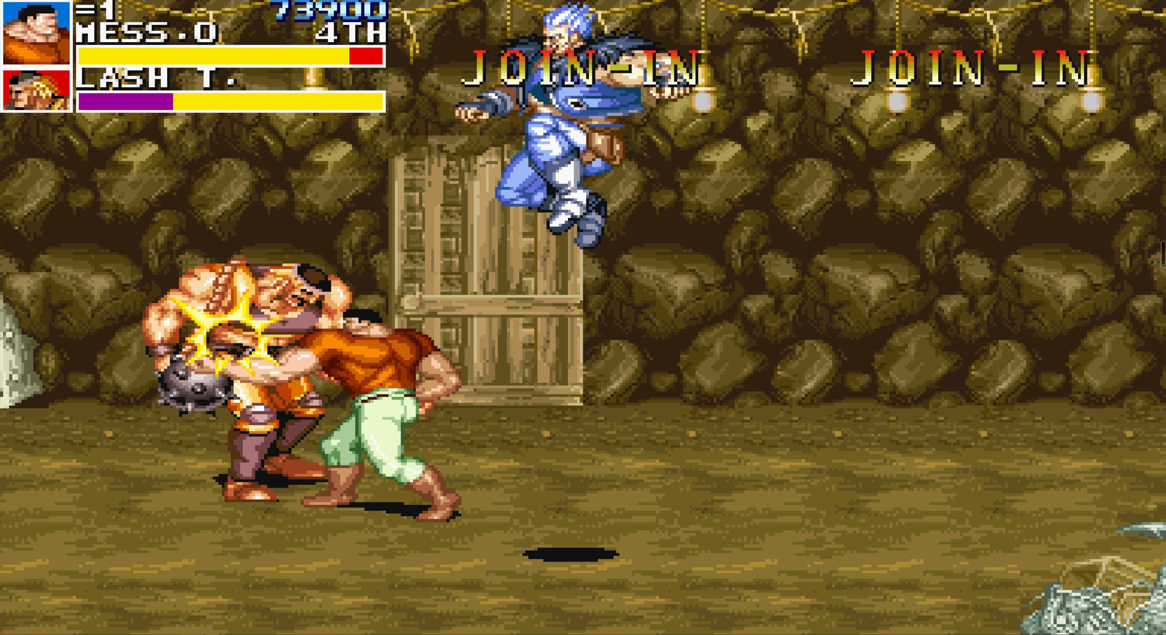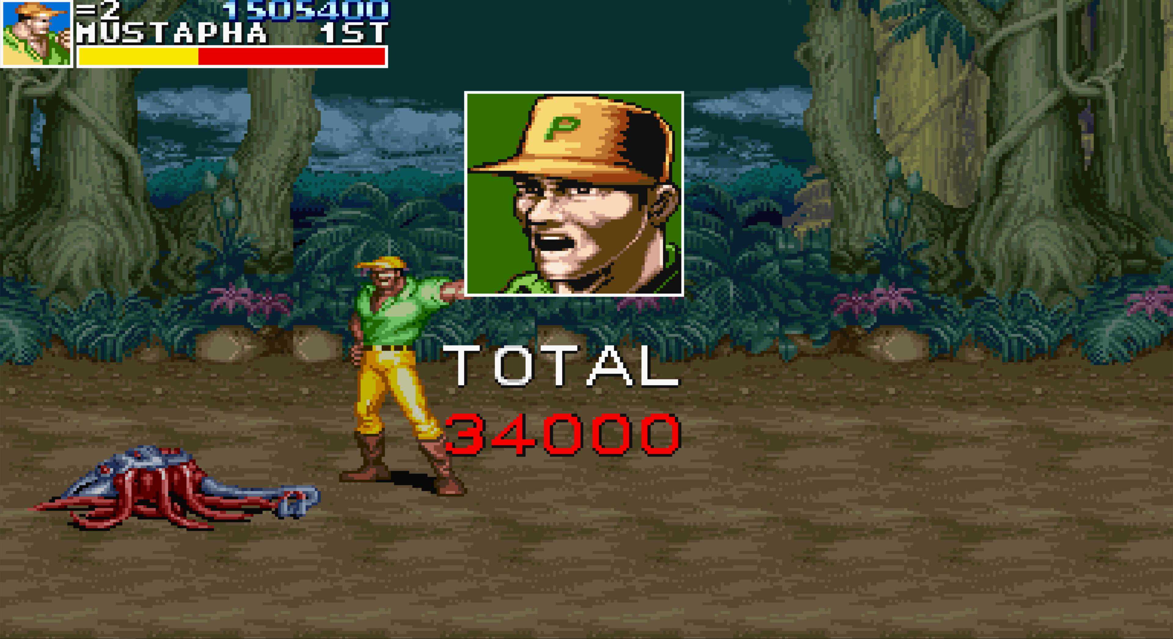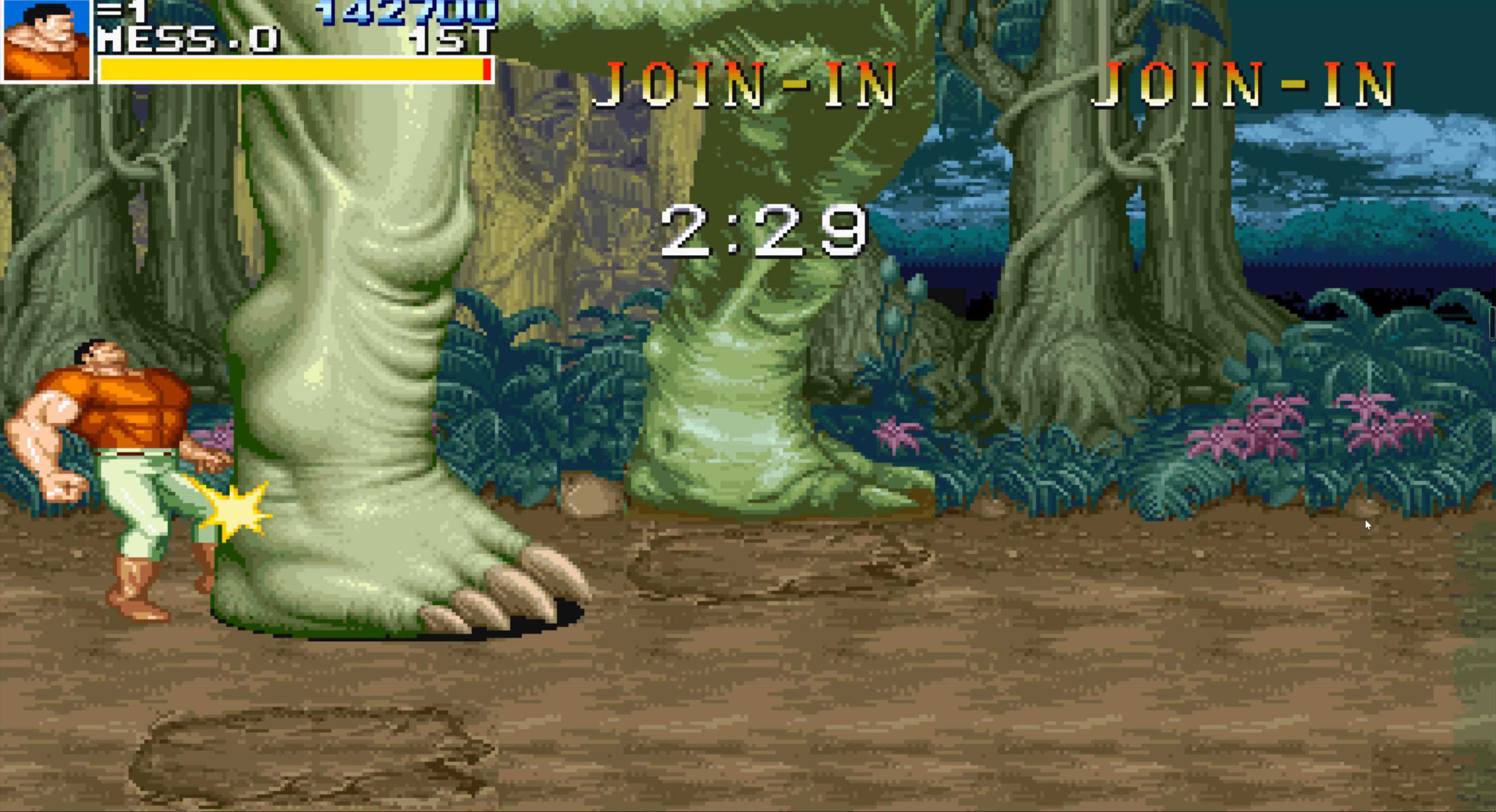 BOSS第二形态,小时候玩觉得真难,因为那时我们只会用“前前A”发动攻击,而这招打不倒BOSS,然后就被又抓又咬。后来知道了这个BOSS要受到两次倒地判定才会真正倒地,于是研究出了先跳踢一脚再连一套组合拳的打法,只要与BOSS错开身位,这个打法还是非常安全的。其实直接打组合拳摔投也是可以直接令它直接倒地的,它的“霸体”并不免疫投技。