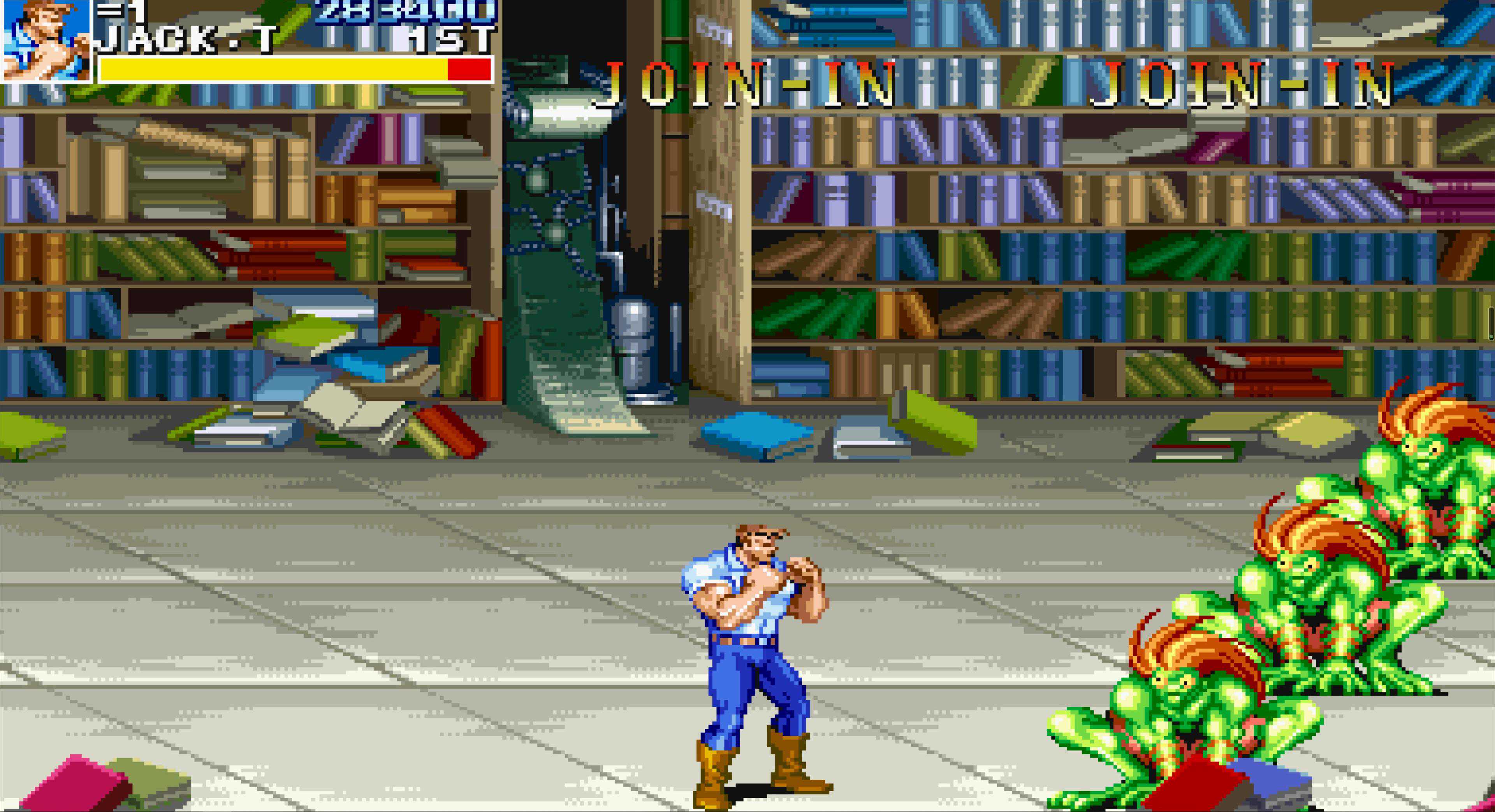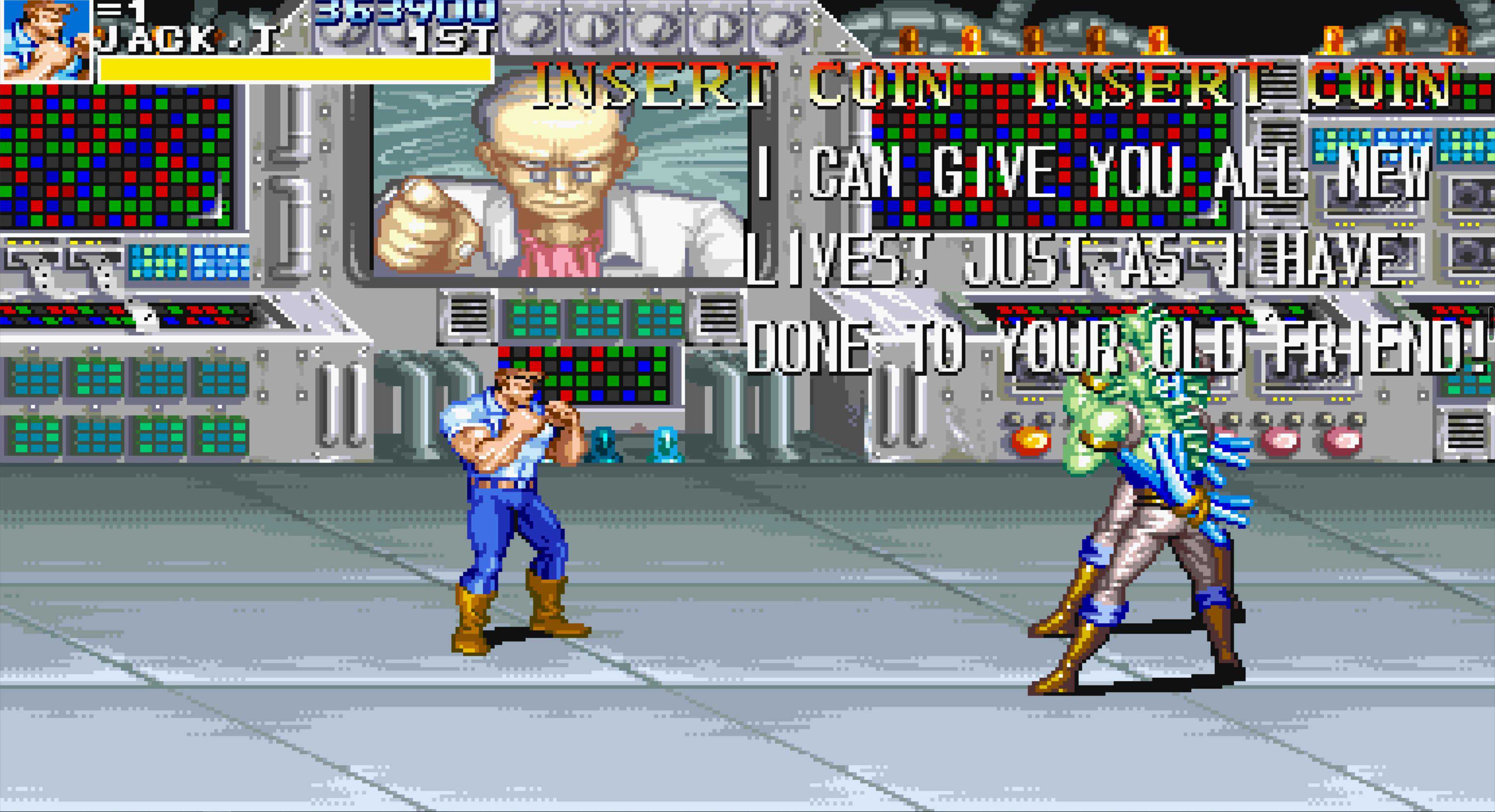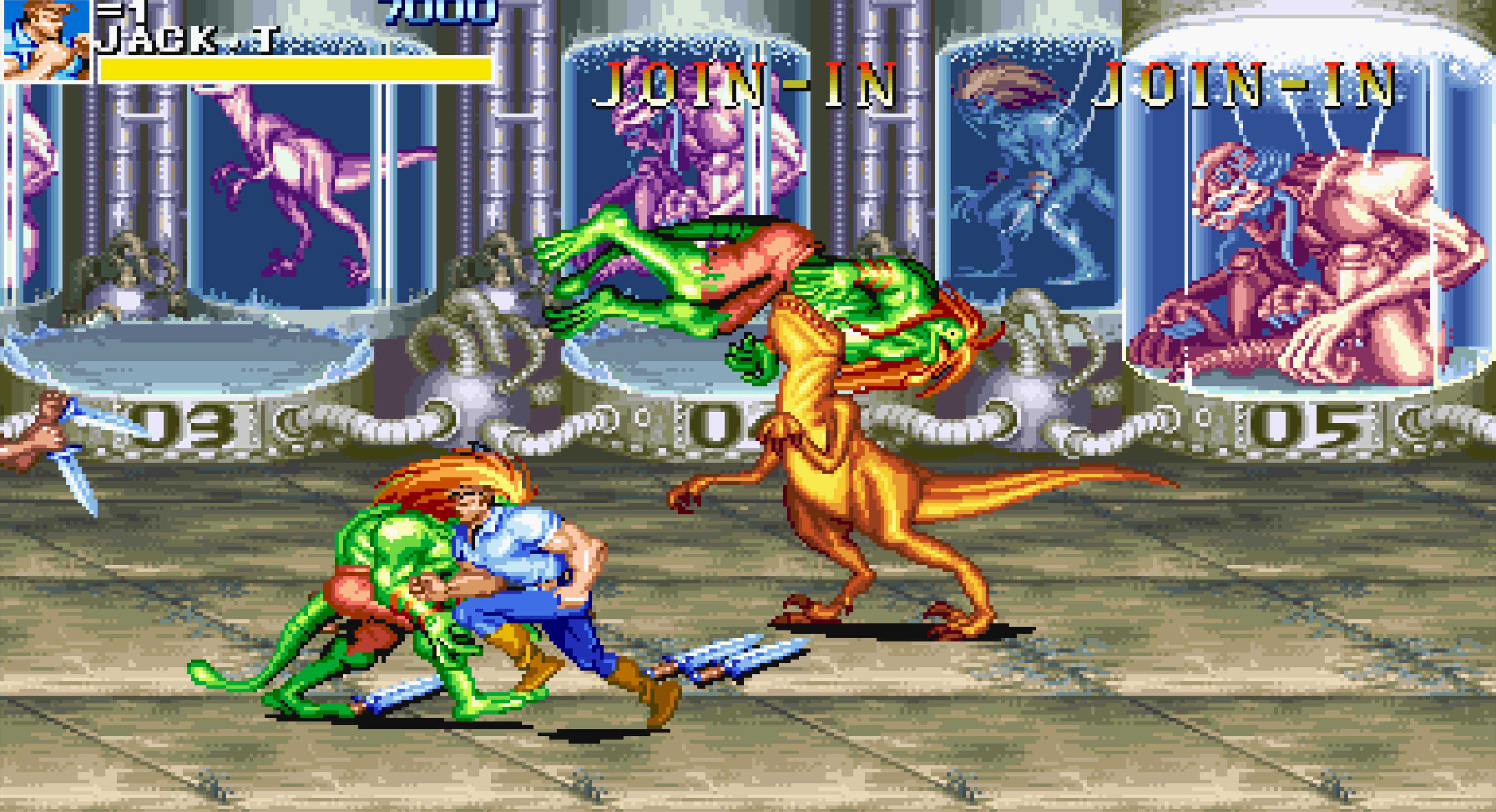 这是“恐龙快打”中最难的一关,在所有老卡的横版街机游戏中,这个BOSS的难度也是排得上号的,小时候玩基本两三条命就扔在这里了。即使现在,我除了用黄帽能有六七成把握一命过关,其他角色依然非常困难。至于安全打法……嘿嘿,没有,反正我是研究不出来。用黄帽不用多说,他的飞踢距离远、速度快,很容易同时控制住两人,且能跳过BOSS的冲斩,相对要简单许多。若是用其他角色,我只能说几个要点: