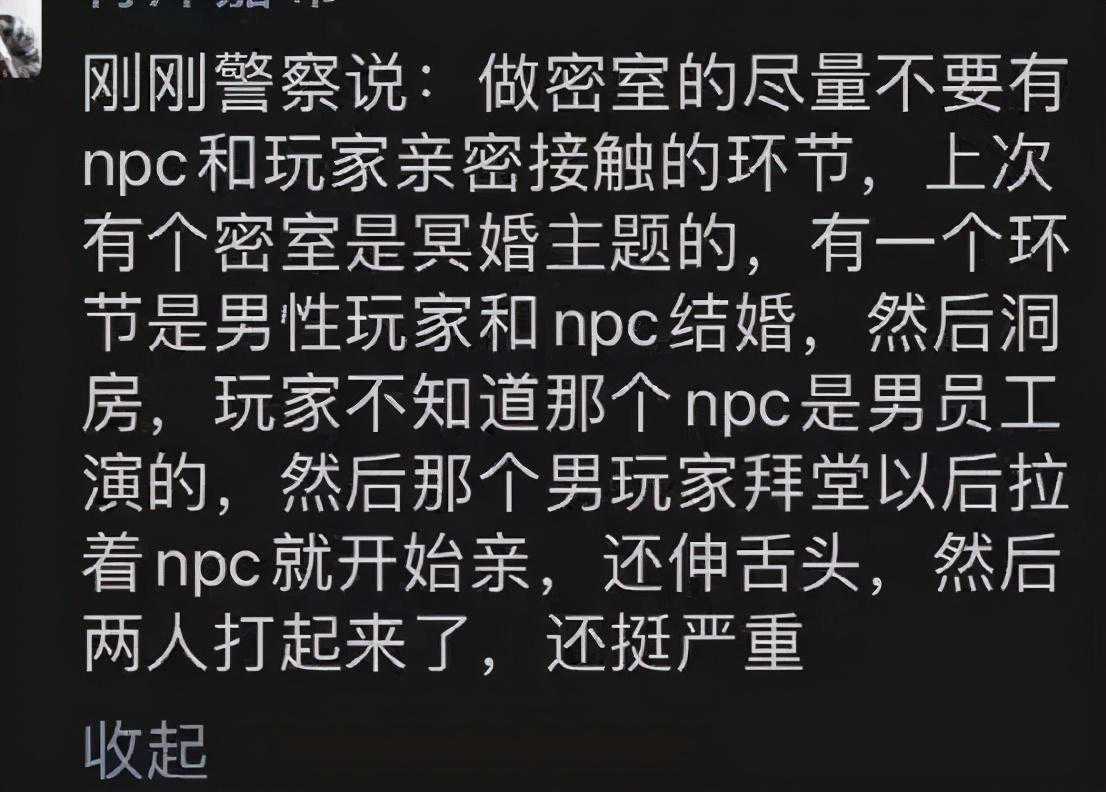 之前新闻报道了这样一个令人瞠目结舌的案例,当时是一个冥婚主题的剧本。要求男玩家和NPC扮演的新娘拜堂,谁知这个男玩家抱着“新娘”就是亲吻,甚至是舌吻。