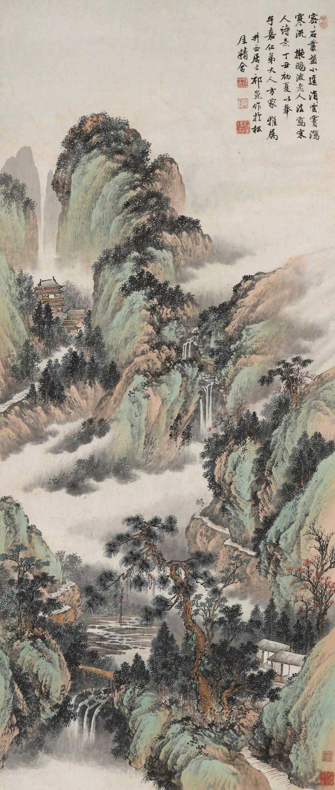 款识:密密石业盘小径,消消云窦泻寒流,拟鸥波老人法写宋人诗意。丁丑初夏以奉子嘉仁弟大人方家雅属,井西居士祈崑作于松厓精舍。