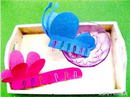 对称的蝴蝶、蜻蜓卡片,装有若干个彩色回形针的小碗
