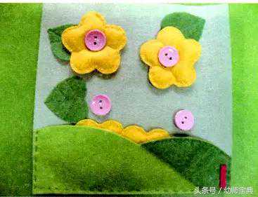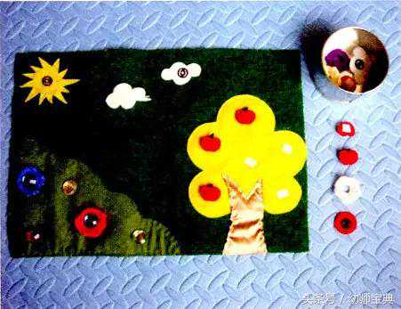 在山坡、树墙饰上分别缝上纽扣、暗扣、魔术粘扣,在栏杆上缠绕藤条,毛线钩的小花,缝有暗扣的树叶,粘有魔术贴的小水果,塑料花,篮子