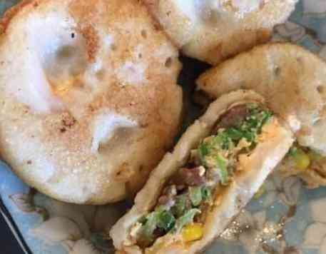 大爷说一遍呈现黄金色就差不多了,这时候再继续两边翻面。一个鸡蛋汉堡大爷算我4块钱一个,因为还加了料,如果没加大爷说一个两块,大爷说他经常出来卖鸡蛋汉堡,路边来来往往的人非常多,有时候生意好,一天可以赚四五百块,平时一天也就百来块,总体来说,味道非常的美味,整个鸡蛋汉堡外酥里嫩。这4块钱值了。