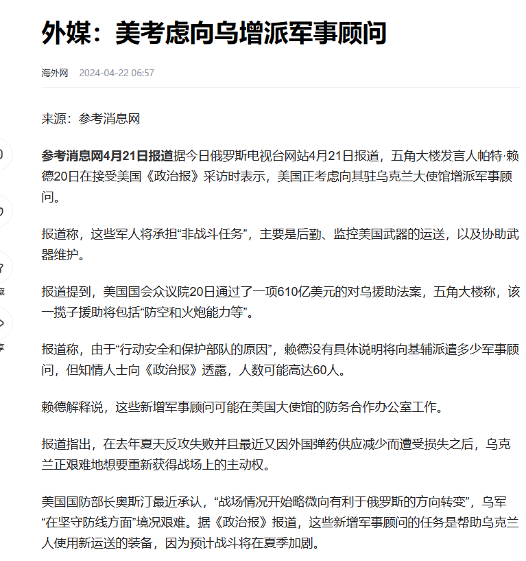 毕竟双方在发生冲突以来,美方支援武器的行为并不在意,但派遣相关顾问还是首次。