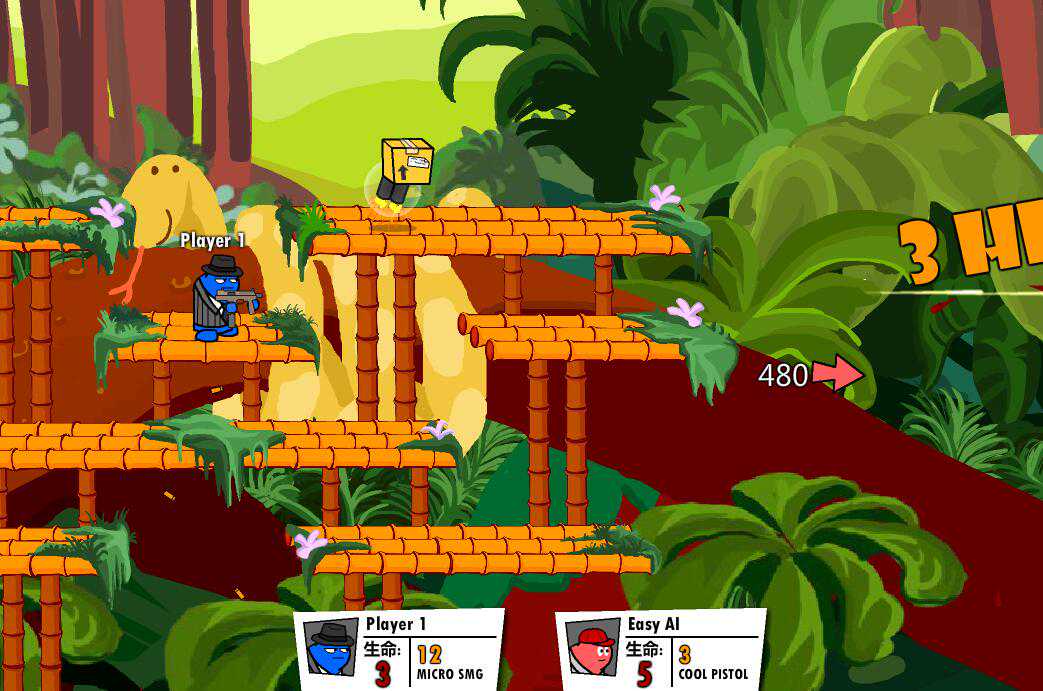 这款游戏可是当时和小朋友们开黑的神作,这款横屏射击类游戏地图很小但是很多,枪械也是一样的有一大堆,玩家们互相射击没有伤害,只能靠枪的冲击力把玩家打出地图边缘才能胜利。而且使用这些枪的人也拥有根据枪而定的后坐力,所以武器的选择也很重要。这款游戏最多支持四个玩家一起对战,想象一下,四个基友挤在一个键盘上操控小人互相伤害的画面,那得有多有趣。