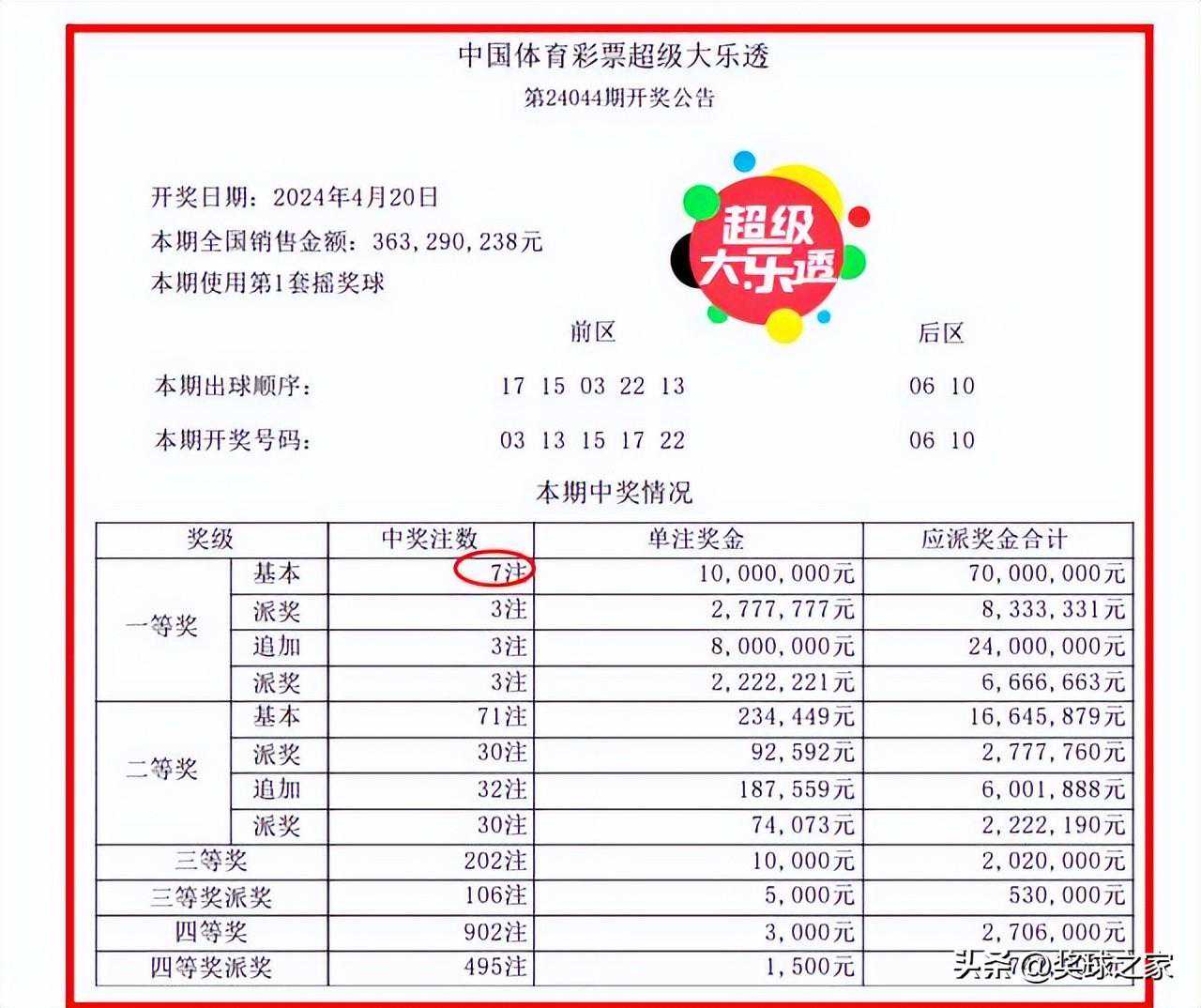 24044期大乐透开奖结果:一等奖7注、3注2299万、4注1000万元