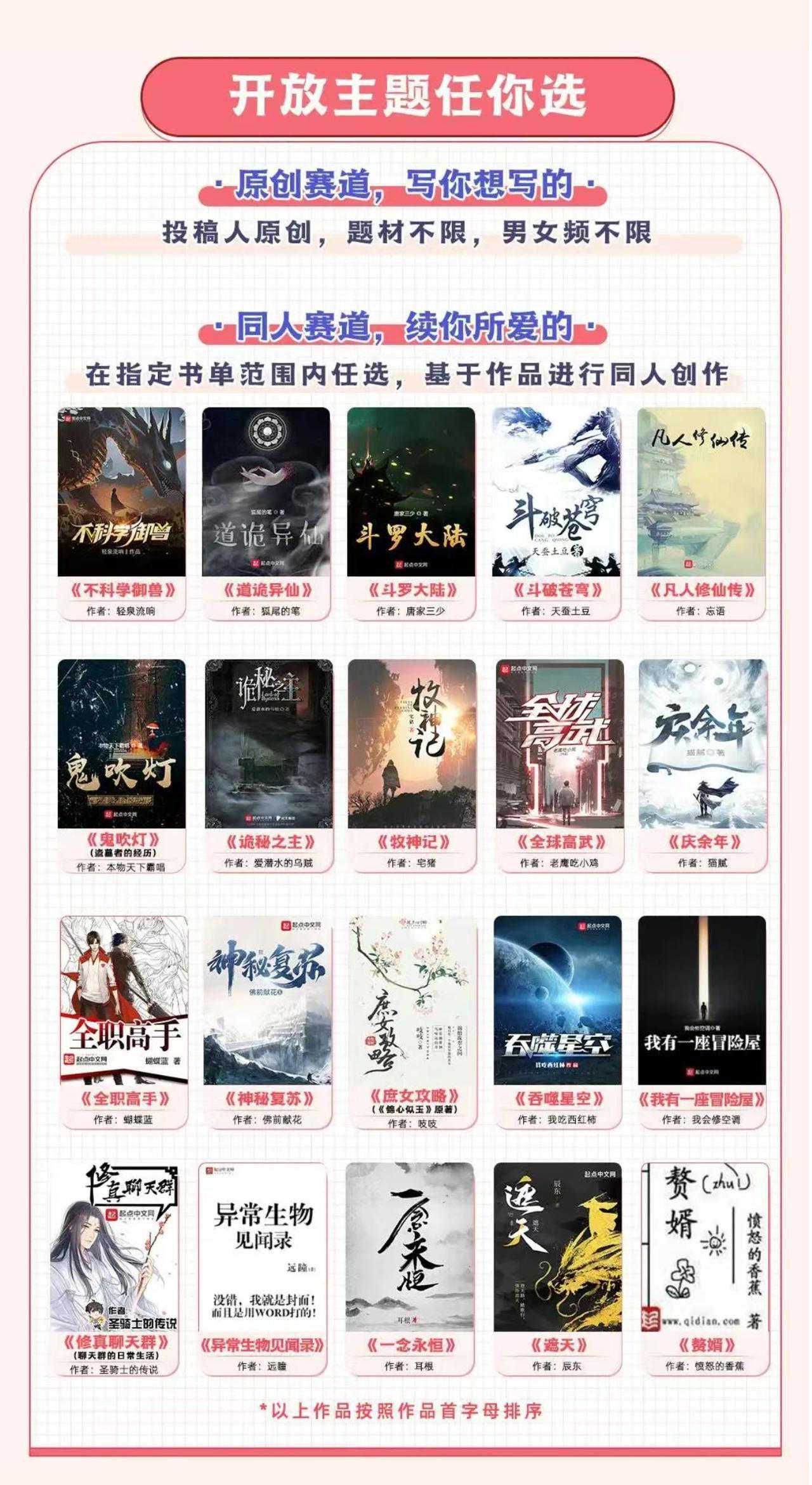 大赛设置原创、同人双赛道,同人创作书单囊括《斗罗大陆》《斗破苍穹》等20本头部IP,给予选手充足创作空间。同时,大赛还创新了线上导师团玩法,邀请知名演员梅婷、知名导演沈严、知名编剧秦雯,阅文集团白金作家“辰东”、白金作家“远瞳”、大神作家“佛前献花”担任创作导师,助力选手更快成长。据悉,本次大赛设立丰厚激励体系,除现金奖励外,排名靠前选手还可获得正式签约机会、作品出海机会、新人培训等成长机会。