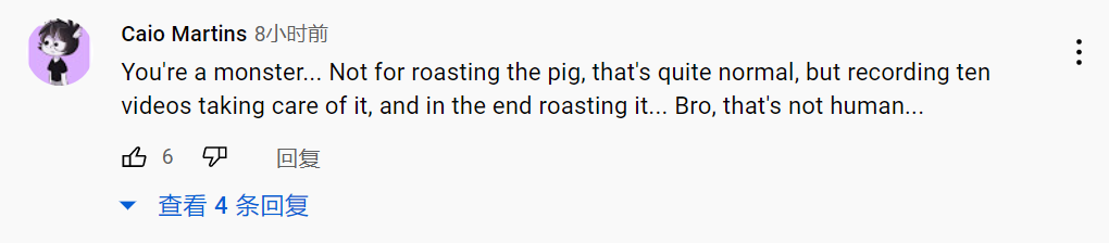 “至少你还给了这只猪一个短暂美好的一生,比那些在养殖场遭受折磨的猪好多了。RIP猪”