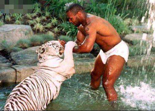 大老虎有很大的攻击性,不过在泰森面前,老虎还是比较温顺,泰森就和老虎玩耍,据说泰森可以一拳打死一头牛,实力有多强悍。