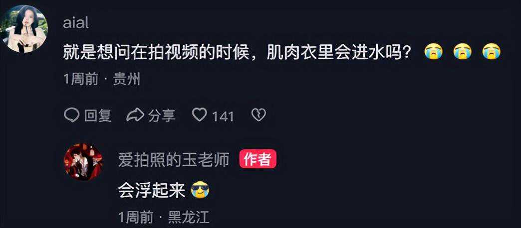 再者,Coser还穿着肌肉衣,进一步增加了水下拍摄的难度,据称,进水的时候肌肉衣会浮起来,得费劲按下去才能拍摄。在这期间,十分考验摄影师抓拍的能力。