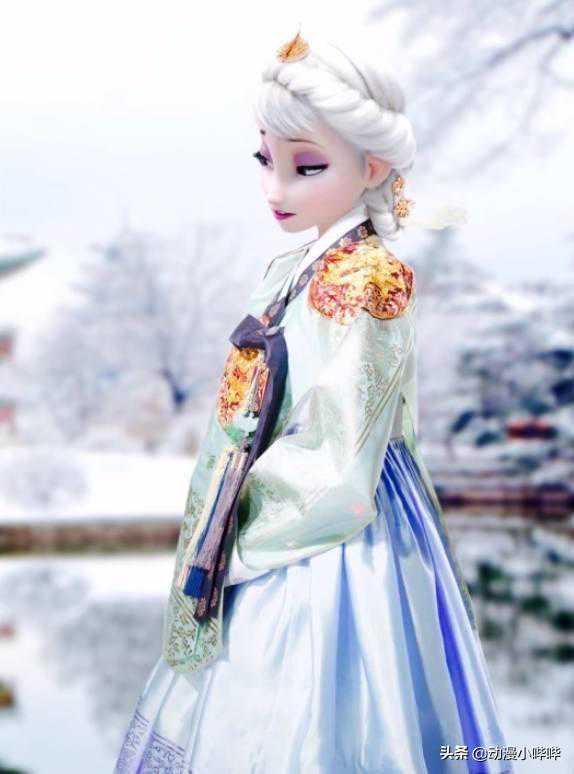 身为气场爆棚的冰雪女王,似乎真的没有她驾驭不了的服装,就连韩服这种充满朝鲜民族特色的古老服饰穿起来都有模有样。素银色短上衣搭配水蓝色褶皱裙的设计,让艾莎看起来高雅纯洁,头上和肩旁的黄色小配饰也尽显皇族风范,搭配艾莎这副霸气又傲慢的表情,小哔感觉完全此时的她完全就是一位朝鲜王朝中的王妃,心机十足!