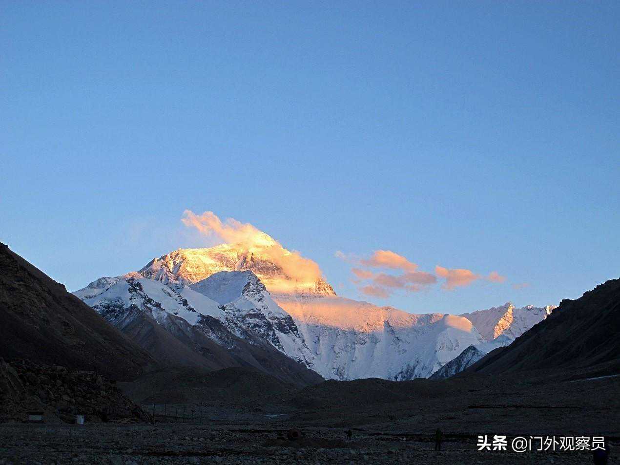 倒是珠穆朗玛峰,藏语意为“第三女神”(就像四姑娘山,最高峰都不是老大,或者是老四,或者是老三),披着金纱,也遮不住她霸气灿烂的笑容。缭绕峰顶的旗云,更像是女神头顶的王冠,昭示着她永恒的荣耀!