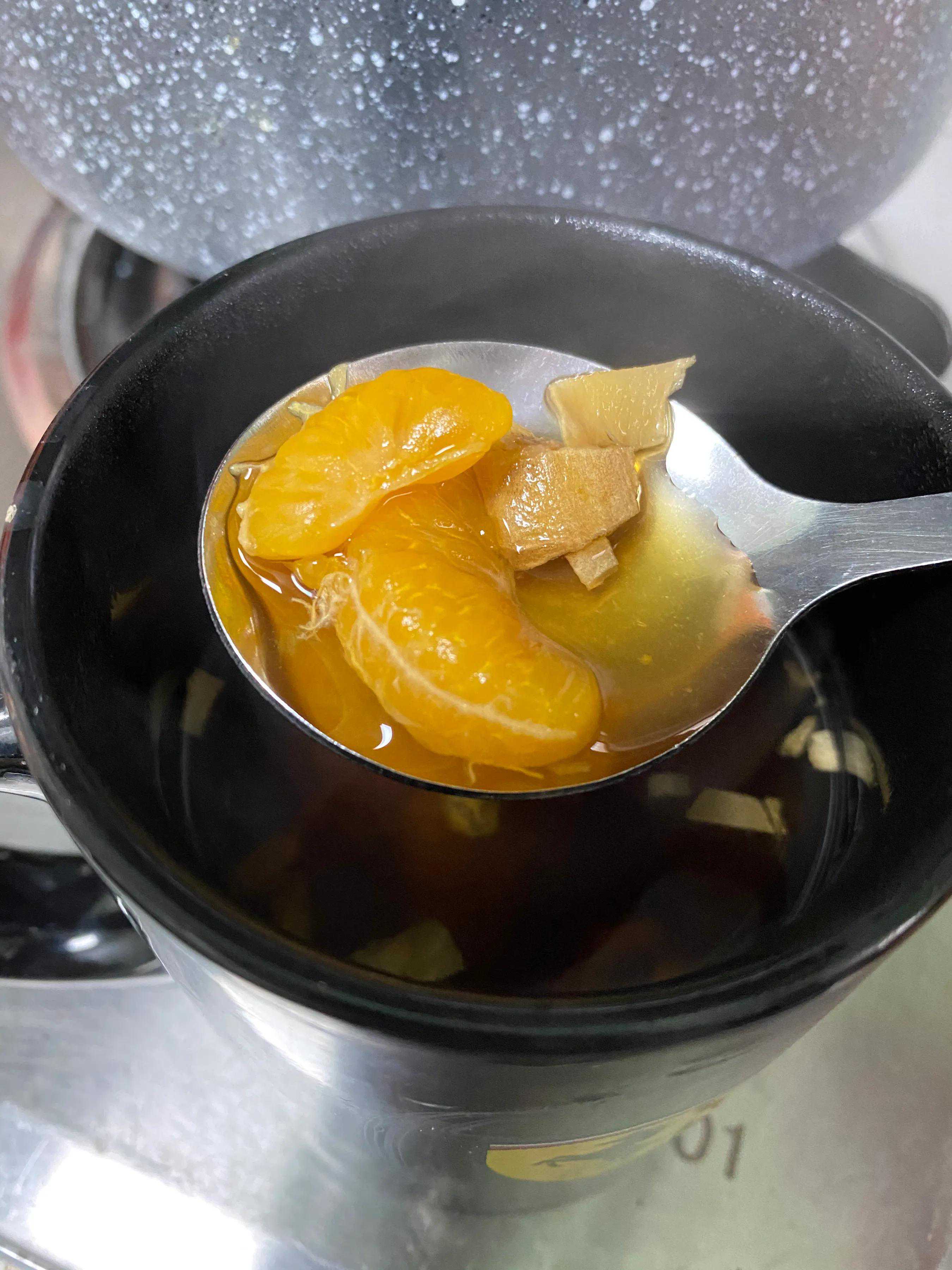 大火烧开之后,多煮个2分钟,让果肉膨胀一下,桔子果汁流进姜糖液!