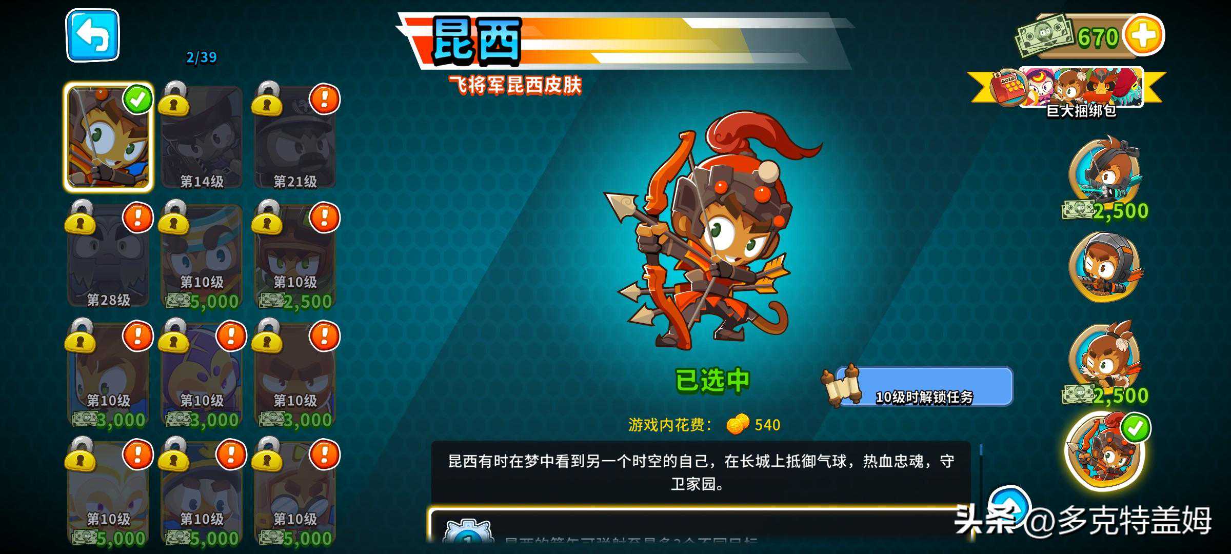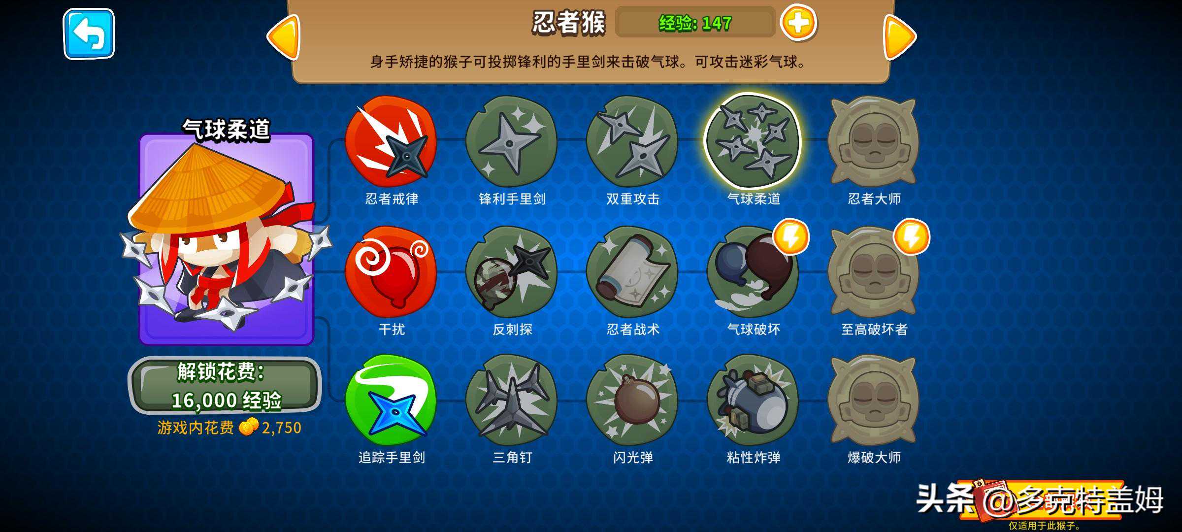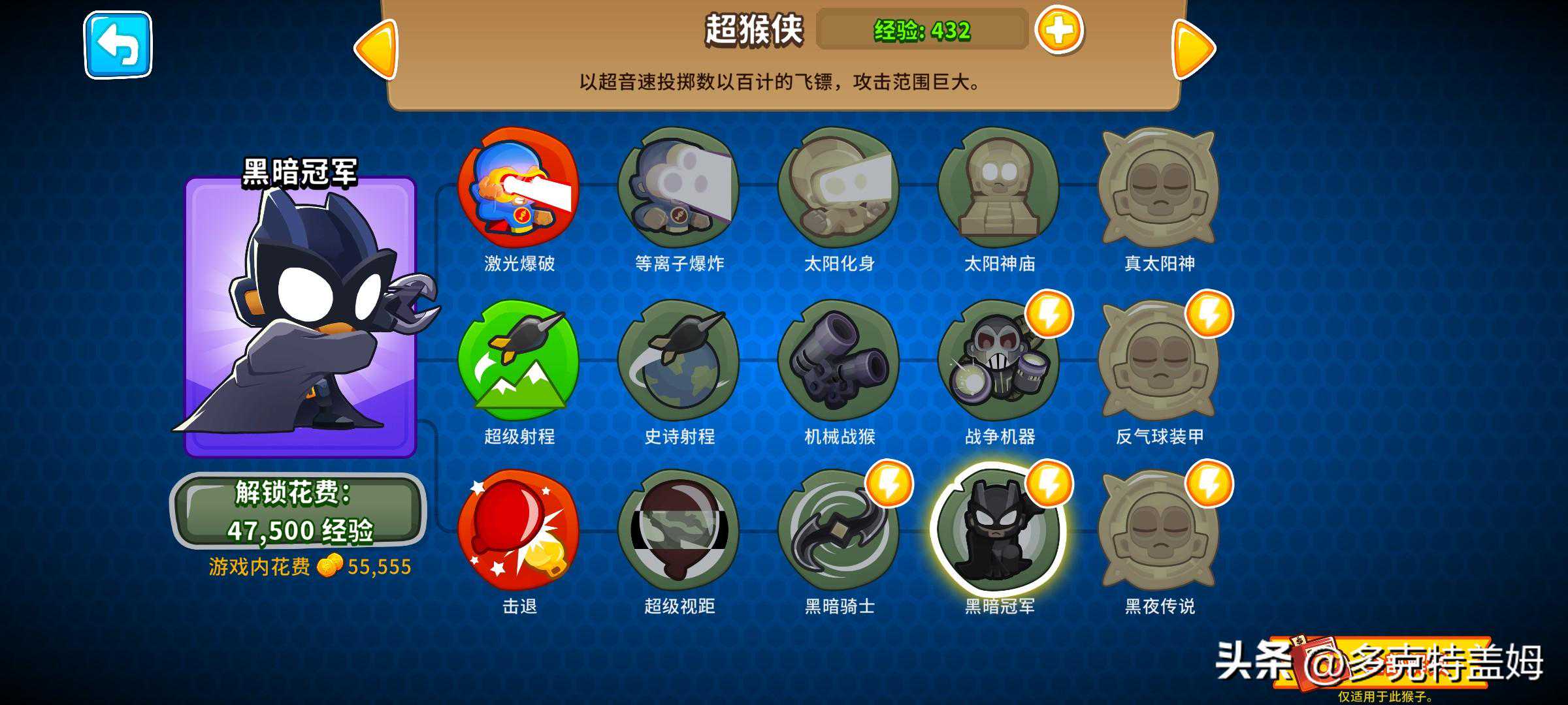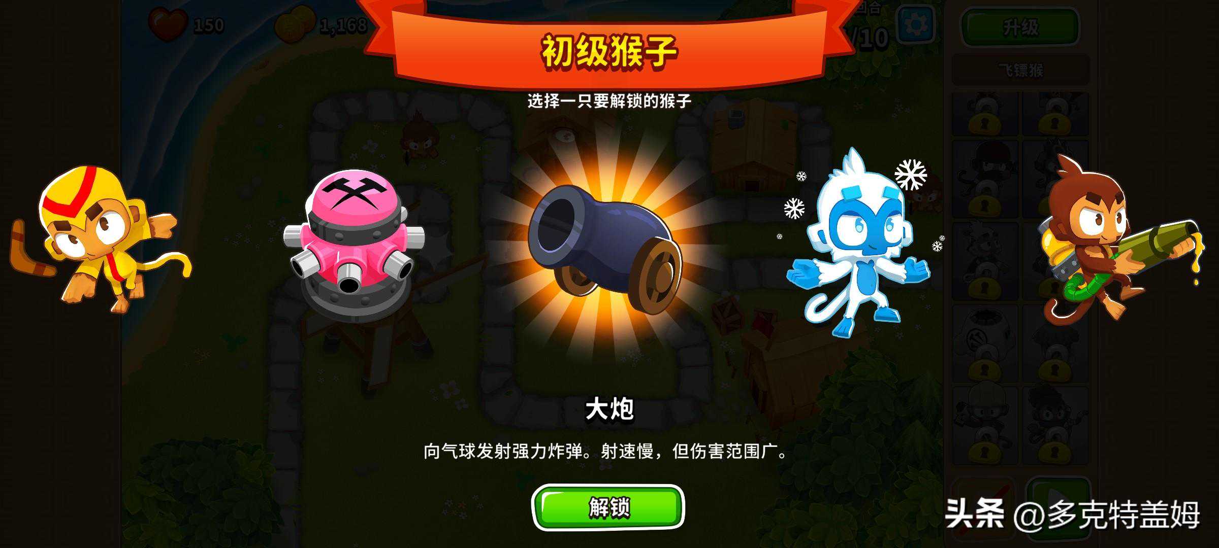 除去以上这些常规猴外游戏中还有着英雄的设定。他们或自带威力不低的诸多技能,不过升级技能树则有着较大差别,玩家无需选择路线而是让他们通过赚经验升级并自行解锁出新的能力buff,有闲钱时玩家也可以通过直接花费金钱加快英雄的升级进度。游戏默认给出通过等级来解锁英雄数量不算多,更多英雄以及角色外观需要通过游戏内的猴币解锁,要肝要氪玩家自行选择。