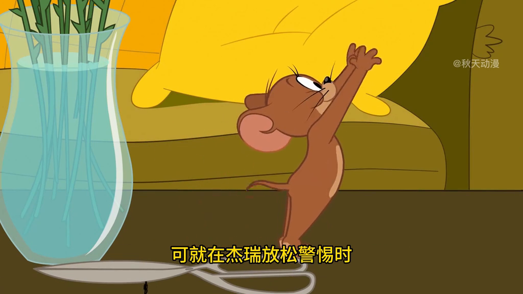 这时杰瑞突然示意汤姆看向窗外的野花,汤姆看完立马开始了行动。此时脚下的种子又让汤姆重新燃起了希望,紧接着就开始耕地,光速撒下野花的种子。可就在汤姆给种子浇水时却发现水龙头似乎有点不听使唤,殊不知这其实就是杰瑞在背后搞的鬼。