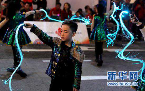2月5日,小朋友在街头巡游时表演。新华社记者吴晓初摄