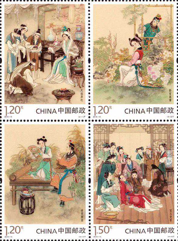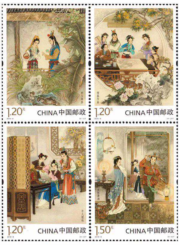 四枚邮票内容为:妙玉奉茶、惜春作画、平儿理妆、夜探潇湘。