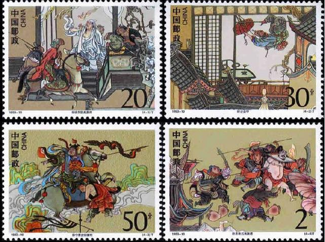 《水浒传(四)》,全套4枚,内容分别为柴进失陷高唐州、时迁盗甲、徐宁教使钩镰枪、劫法场石秀跳楼。