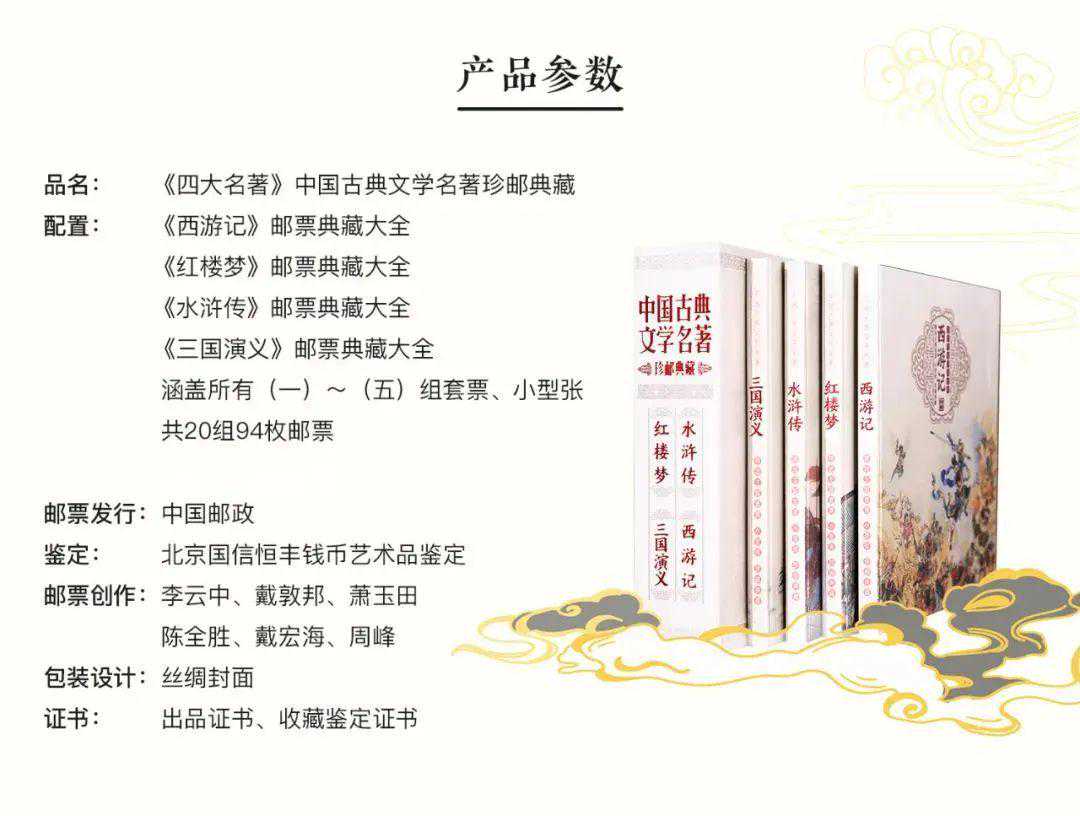1.百年收官之作:四大名著系列珍邮终于迎来收官,一次集齐,涵盖四大名著系列珍邮(一)~(五)组所有邮票,跨时36年,20组94枚,应收尽收,全系收录,一枚不落,珍藏意义无与伦比。