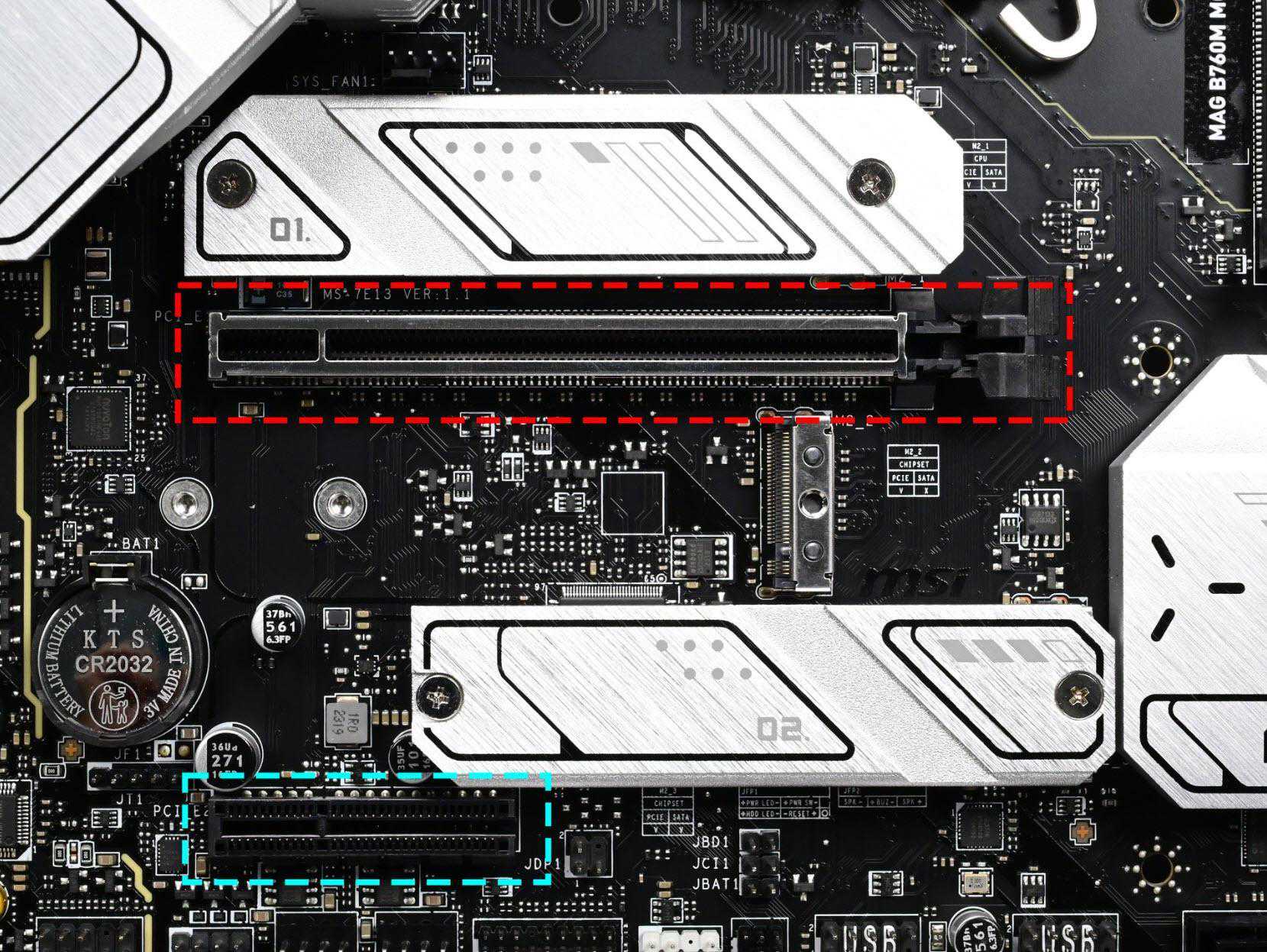 此外,这款主板还拥有两根PCIe插槽,其中上边带有金属屏蔽罩的插槽(红色)为PCIeX16显卡插槽,该插槽由CPU提供位宽,支持协议及16倍速率。下面的插槽(蓝色)则是由芯片组提供,支持协议及4倍速率,该插槽为PCIeX4接口。这些插槽的多样性和高速度可以满足不同类型硬件的需求。