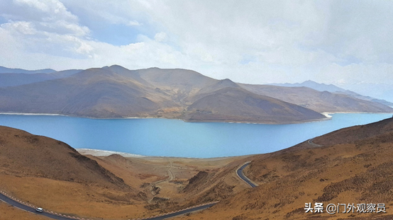 褐色岩石裸露的山体,一条蜿蜒曲折的黝黑公路,像一条腰线和谐完美地搭在了山体上,苍凉中蠕动着活力。羊卓雍错,三大圣湖之一,离拉萨最近。蓝色的湖水,褐色的山体,不知是谁装饰了谁!