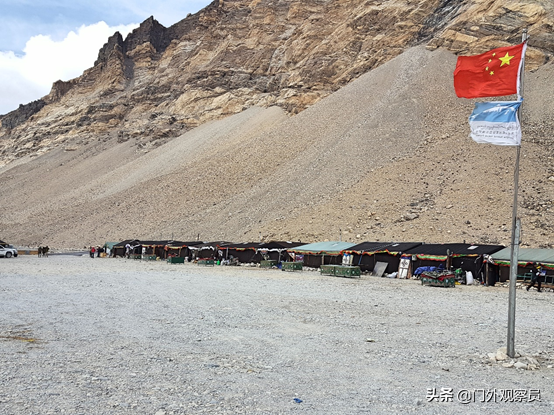 我们所在的帐篷区,其实是一个过渡区,将游人、车辆、旅游服务挡在了大本营的外边。真正的大本营还要乘营区的中巴再往里走5公里左右。既是到了那里,也不让我们进入那些正在集训,整装待发的帐篷区。一是需要登山证,二是要在登山学校(就是珠峰的登山服务商)报了名,统一组织才能进去驻扎。中巴司机带我们登上了一个大概二十多米高的小山坡,上面有两个藏族青年,一边帮游人悬挂经幡,一边照看着佛塔的香火。这里既能察看到大本营的状况,也能对珠峰做一次最亲近的凝望。对于我们这些到此为止的俗人凡客来说,只能望着大本营帐篷里胸怀梦想的勇士,心里酸溜溜地安慰自己,“虽然我不能登上去,但我用心触碰了珠穆朗玛”!