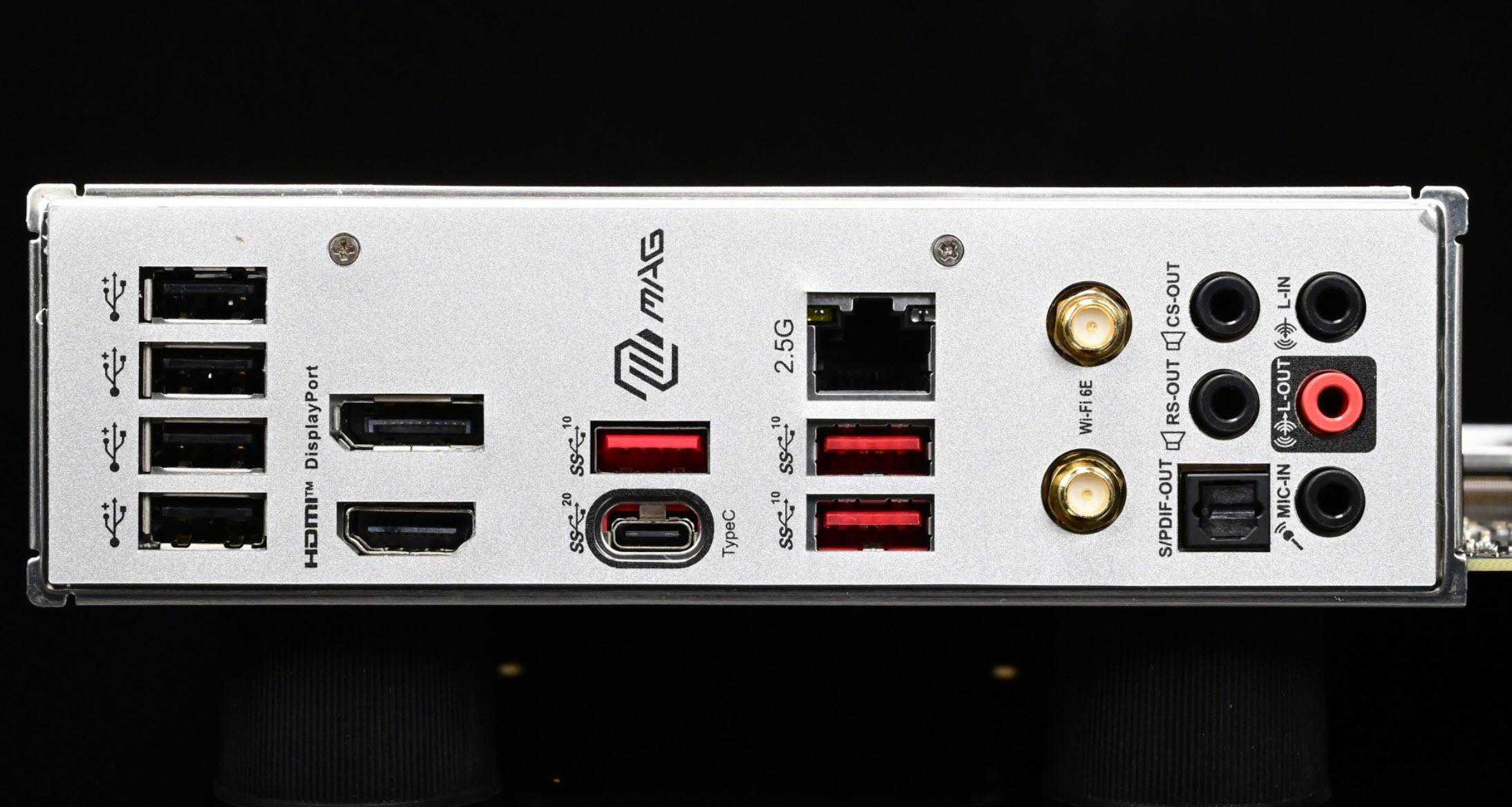 IO接口方面,整体式挡板使得接口更加易于使用。具体来说,它提供了4个接口;1个DP及1个HDMI接口;1个以及1个*2Type-C接口;1个2.5G有线网卡及2个接口;1组Wi-Fi6E无线网卡的天线和1组带光纤的高清音频接口。这些接口可以满足消费者在各种情况下的连接需求。