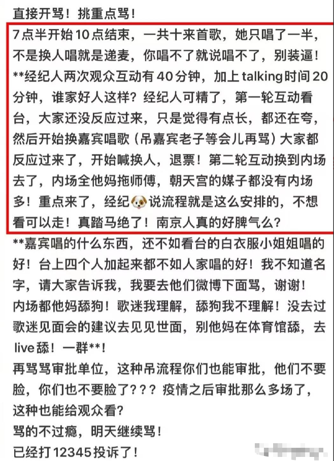 这就更加惹恼了粉丝,有些愤然离席,有些高喊退票,也不知道曾经的天后看到如今粉丝们喊退票的场景心里有何感想?