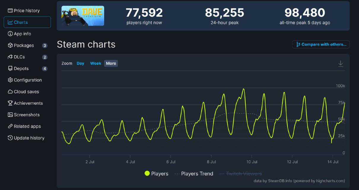 这个七月上旬和中旬的游戏市场,是属于《潜水员戴夫》的——这么说并不夸张,本作的数据一直在涨,同时在线人数逼近十万大关,销量高达一百万份,好评率还是高达97%的特别好评。从一个名不见经传的小体量作品,到七月最火的爆款,我们当然会想问出那三个字“为什么?”