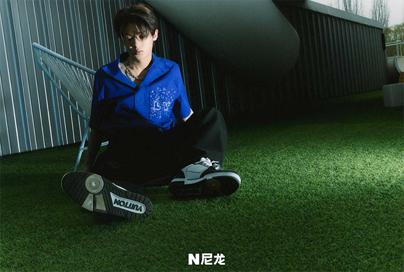 白色花衬衫,黑色长裤外搭短裤,手中举起防晒外套,奋力向上奔跑的少年。阳光照耀下,他身着亮丽橙黄的长毛衣,脚上蹬着一双黑色毛毛鞋,掀起衣角举向头顶,做出展翅飞翔的姿势,少年的精致秀气的脸,眼神里夹杂无所畏惧和漫不经心。