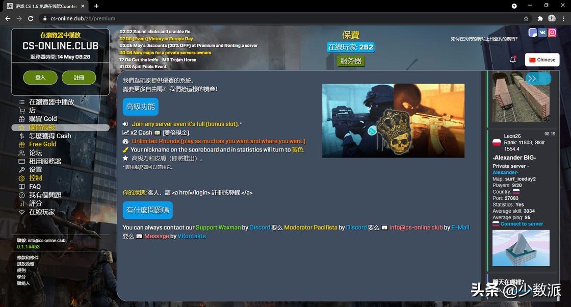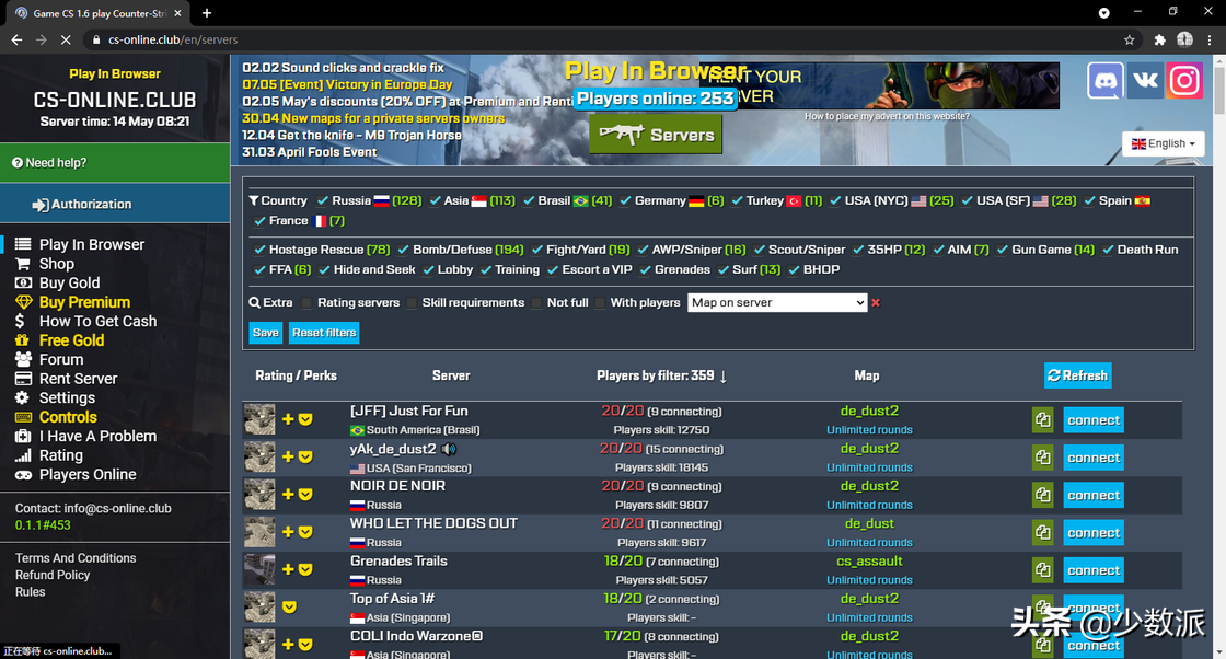 在主页中,你可以看到不同的房间、地图、设置和地区服务器过滤等等设置,俨然一个CS「私服在线版」;事实上左侧提供的商店、会员、等设置也说明它的确有这种性质,不过这并不影响我们随时打开以游客身份来一把。