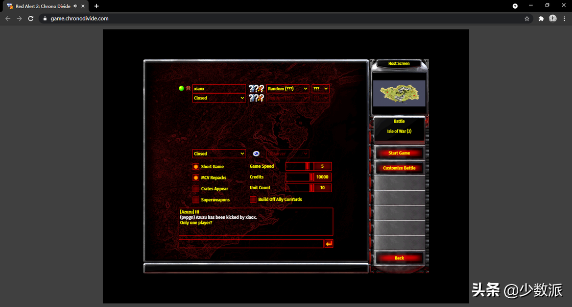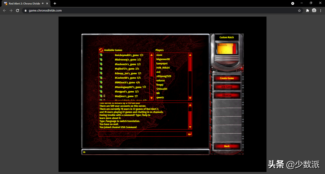 和上面的CS不同,网页版《红色警戒2》采用了充满童年记忆的登录界面,看到这个飞艇我就已经开始微笑了。注册账户后登录可以看到许多对局,我们可以创建自己的对局或者加入他人的对局。另外创建对局后还可以设置密码等朋友来一起玩,以往在客户端版本中能够看到的地图、超级武器等选项也一应俱全。