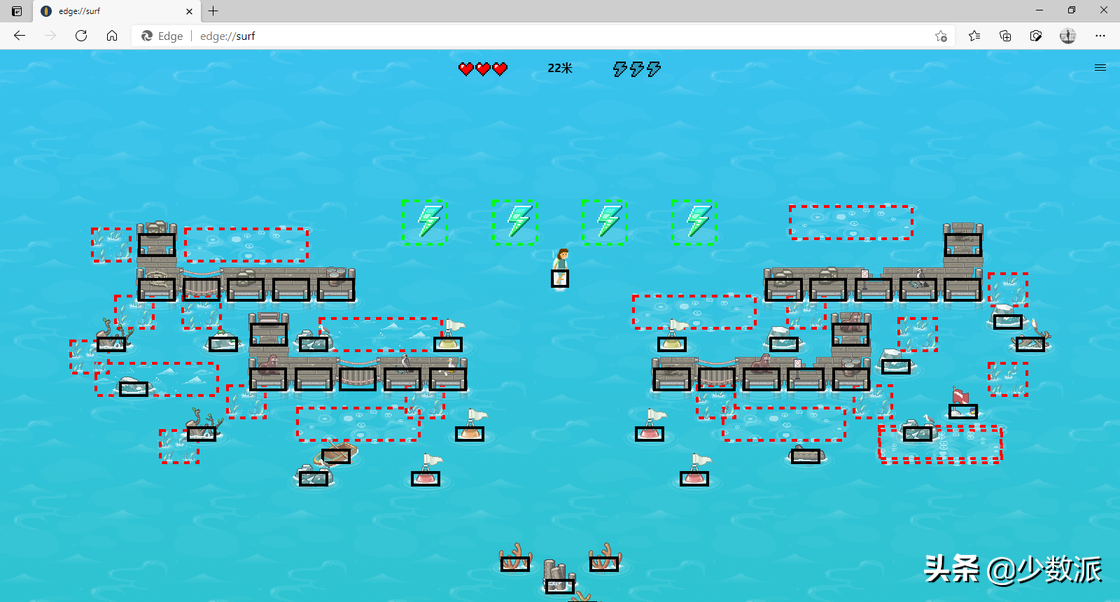 你的小人一开始拥有三条生命,每次撞到障碍物后会丢失一条生命,不过中途也会有红色的❤来续命;另外如果有幸捡到闪电⚡,按下F键可以快速加速(虽然个人建议不要这么使用,因为很容易触礁);中途也会有加速器,穿过它也会获得加速;游戏途中偶尔还会遇见机器人和你一起冲浪——他们也会触礁。