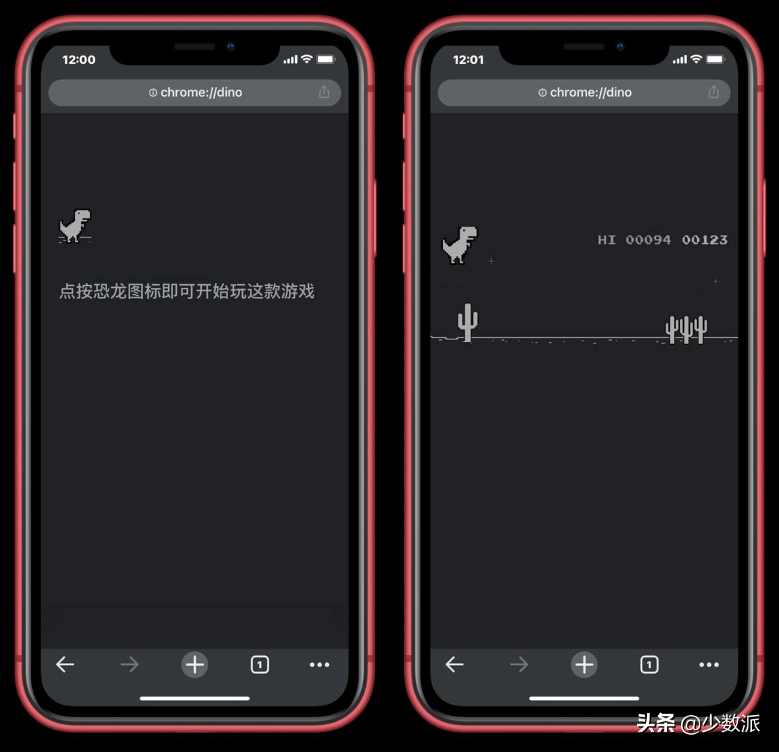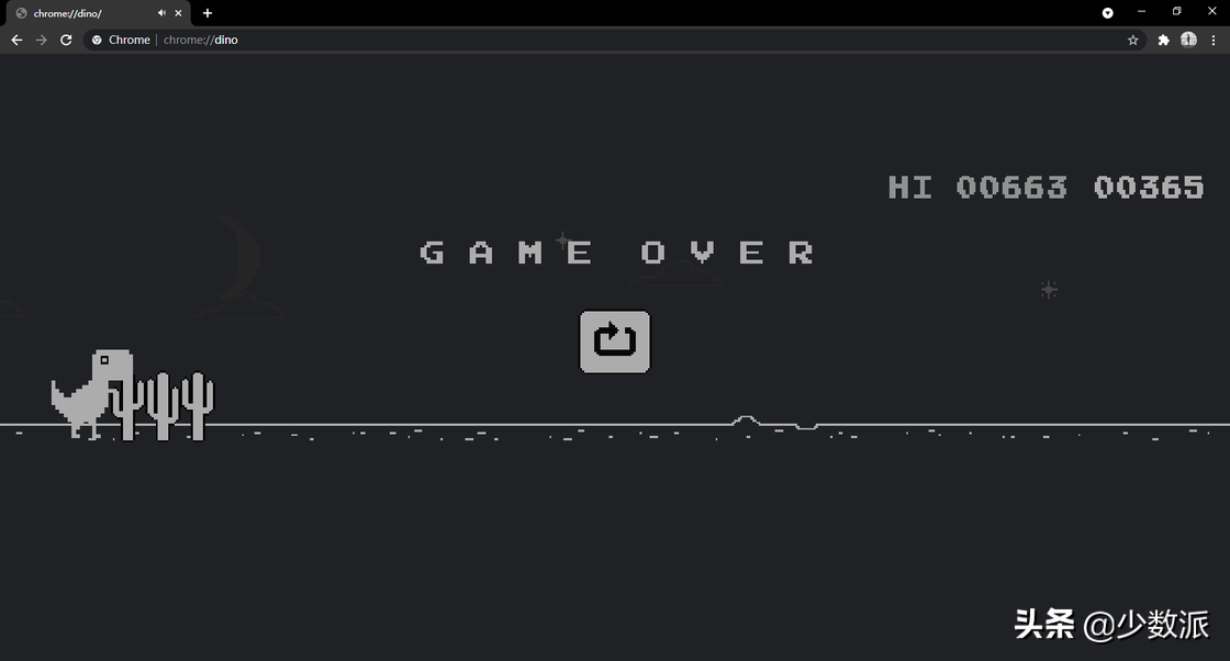 断网后随便访问一个页面都可以打开这个小游戏,在联网状态下我们也可以在Chrome地址栏里输入chrome://dino/来跳转打开,手机上同样适用,起身倒咖啡的时候也能来一把!