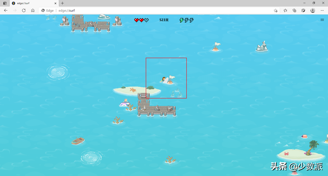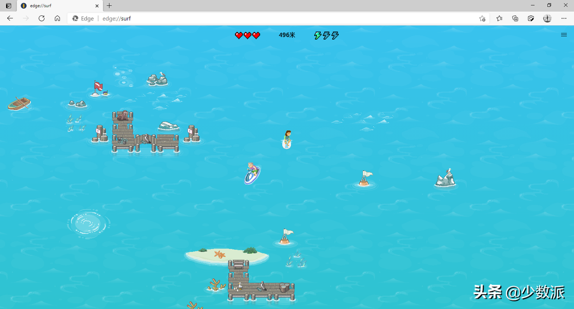 在任何状态下我们都可以通过在地址栏输入edge://surf/的方式来进行游玩,具体需要我们做的是通过方向键左、右来控制角色移动,躲避海面上的障碍物;方向键上可以让人物停止不动,方向键下则是直线前进。