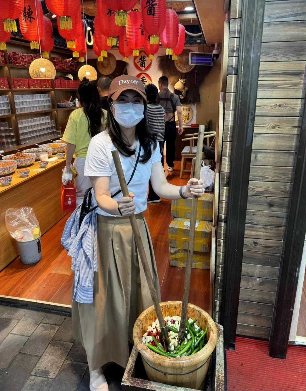 最搞笑一幕就是她双手拿着木棍,在商店门口捣菜的模样。
