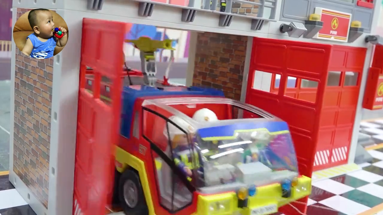 ·消防车出动,消防车来到事故地点,消防员赶紧爬上消防车,喷射水枪将熊熊大火扑灭。