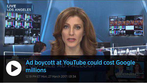 2017年3月的新闻截图:广告商抵制YouTube,可能令Google损失百万。