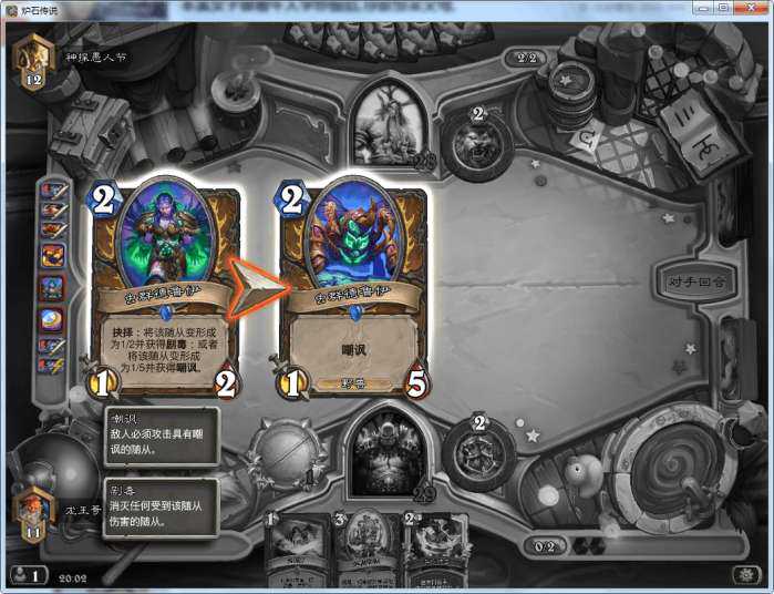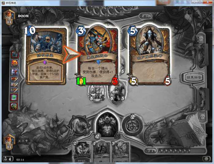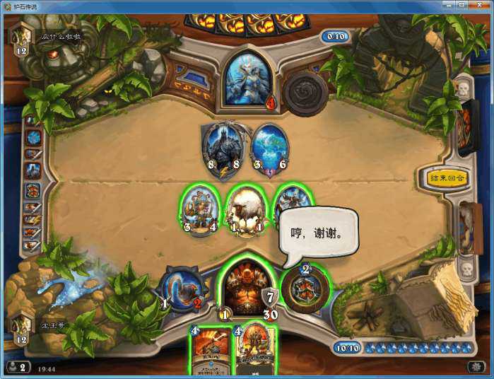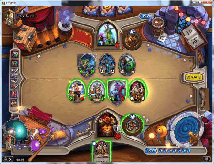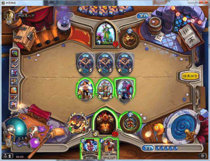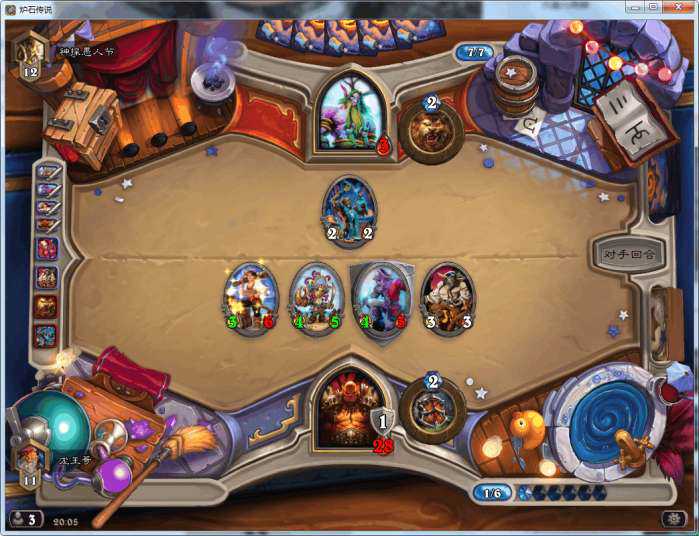 一直到6费,对面的德鲁伊只剩下3血了。而小编这边是4海盗战铺场,对面除非再掏出个传播瘟疫,并且不断叠加护甲才行。