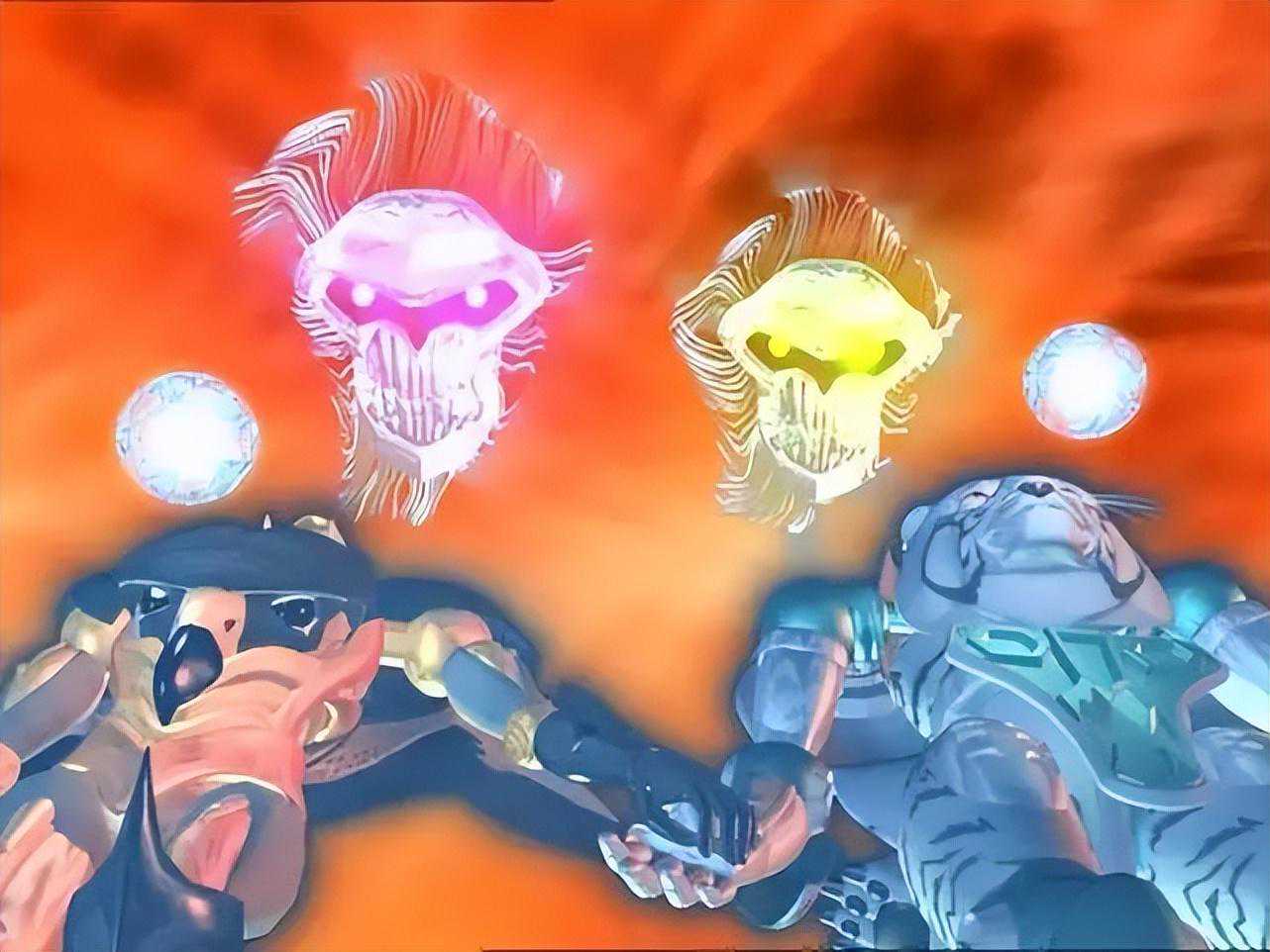 战斗面具作为世纪初玩具的一大玩点并未在动画里有所体现。白虎的面具隐藏在头雕的后脑勺,绿色的骨头造型面具颇有史前文明的味道。