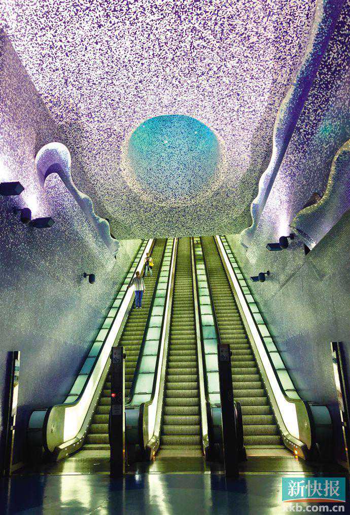 回到那不勒斯商业街,进入地铁一号线Toledo站,发现无数的LED灯点亮地铁站的入口,把马赛克墙壁照得一片蔚蓝,布满星星点点的光斑,犹如波光粼粼的大海,又仿佛浩瀚的星空,原来它的设计主题是“光与水”,被不少游客誉为“世界最美”地铁站,很多人会特地到这里“打卡”拍照留念。
