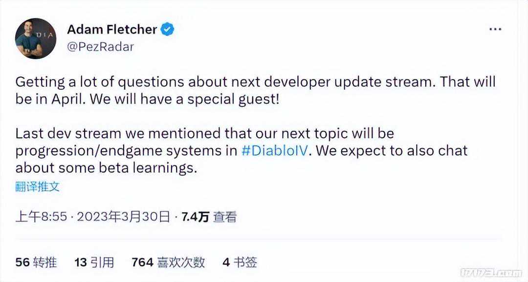 《暗黑破坏神》全球社区开发总监AdamFletcher发推确认,《暗黑破坏神4》下一次开发者更新直播将于4月到来,而且将有一个特别嘉宾。
